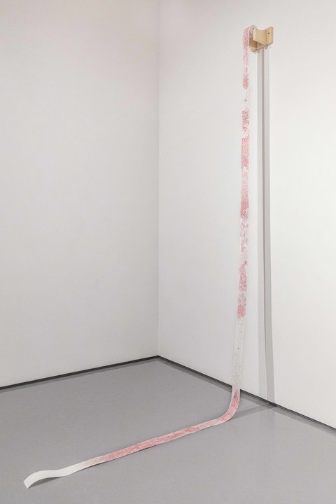 Isa Abedrabbo's Payments in Red materializes grief, rage, and the overwhelming inconceivability of ongoing violence through a fragile yet unrelenting form. Abedrabbo's work gives shape to the indescribable and traces historical cycles of violence. Using receipt paper, a material associated with transactions and data, and anatomical drawings of the human body, the piece interrogates how human suffering is often reduced to economic and political abstraction. The long, unspooling scroll suggests both a record and a wound, its continuous length evoking the scale and persistence of loss. Payments in Red speaks to the artist's Palestinian heritage, embodying both personal and collective grief. The piece is not just a document, but a refusal to accept violence as inevitable. Through its materiality, the work invites the viewer to confront the weight of what is often dismissed as distant or impersonal, transforming abstraction into something impossible to ignore.