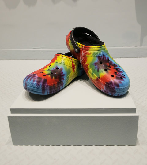 Objects exploring fashion’s pandemic responses include a limited-edition housedress made by independent fashion label Batsheva, a statement on new challenges of domesticity and motherhood experienced by women bound to the home with their children. A series of brightly-colored sweaters knitted by private individuals after a pattern released via social media by J.W. Anderson reflects the nostalgic trends of knitting and “cottagecore” taken up during the pandemic, but also questions the meaning of high fashion and the role of designers in an increasingly isolated and digital sartorial landscape. Do-it-yourself (D.I.Y.) chore coat and dye kits by Reese Cooper further illustrate fashion’s embrace of at-home “make do” handicrafts at all price points, while a Risen Division jumpsuit and a pair of tie-dye Crocs echo the practicality of uniforms worn by frontline healthcare workers. A section that explores fashion’s prominence as a form of protest and activism includes objects such as an EMME face mask in an indigenous pattern by Native American activist designer Korina Emmerich and a hot pink pantsuit, a color and style imbued with political meaning in recent years, born of the collaboration between women’s workwear brand Argent and women’s activist group Supermajority. A white ensemble worn at the Brooklyn Black Trans Lives Matter March is a testament to fashion’s allyship and adds a new dimension to the long history of white as a color of political protest. The exhibition also includes an “End Systemic Racism” bag by leading designer Brandon Blackwood, which was propelled to unexpected popularity by its unequivocal message.