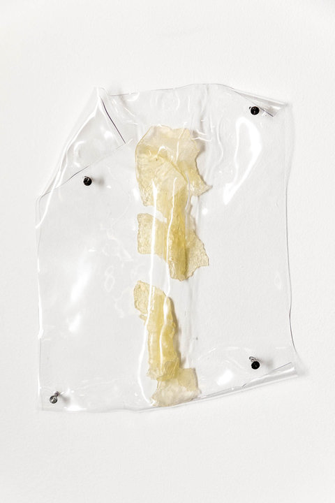 Through performative video and sculpture, Runyon makes the limitations of our binary definitions of race and gender legible. Using their body as a medium in their video works, sometimes placing it into physical danger, Runyon literalizes the suffocating sensation of failing to fit into predetermined spaces and definitions. In both their video and sculpture works, the artist uses plastic to create barriers and boundaries. Nailed to the wall or placed on a pedestal, their sculpture features organic strips or shapes of clear plastic that hold both found and made objects. Like skin, the plastic becomes a membrane and a container for symbols of identity. The transparency of plastic mimics the invisibility of identity formation in the everyday, while simultaneously allowing us to penetrate its surface. What emerges are the grey areas where our definitions disintegrate, and the self comes into being.