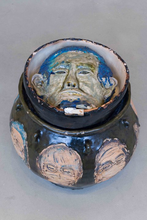 The exhibition functions as an inverted archeological practice which displays contemporary material artifacts––instead of ancient material culture––to deal with the past through the present, with one eye on the future. For example, David Ma’s Selfless Family/ Selfish Boy copes with his family history and expectations, thereby opening a path for the future. The blank faces represent Ma’s understanding of the Chinese cultural conception of the family combined as a single unit, instead of a collection of individuals. Moreover, the overwhelming number of figures emphasizes the judgement of his family, and society in general, for choosing a career in arts. Works like Selfless Family/ Selfish Boy explore a per- sonal chronology within the internal excavation of the self.