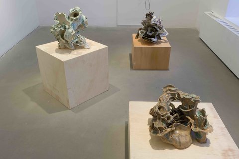 Rhea Barve’s ceramic objects can be seen as representations of fungus or Anthozoa as well as models for large, all-encompassing environments. They are inherently mutable. Due to their multi-readability, these sculptures elicit both macro and micro environmental phenomena: they play out their imagined ecologies on the scale of massive geologic formations as well as small, algae-filled, tidepools. The clay exposed by the uneven application of glaze recalls the alchemical processes that turns this fine-grained soil into objects able to endure the passage of